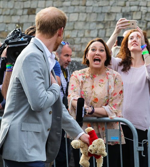 Prince Hot Ginge graciously greeted the peasants outside of Windsor Castle on his last night as an unmarried man, and he came face-to-screaming face with a reporter who let out a shriek as her retinas were burned by his fiery hotness. And no, I’m not the reporter. I’m obviously the mic who is sprung for PHG – Celebitchy
