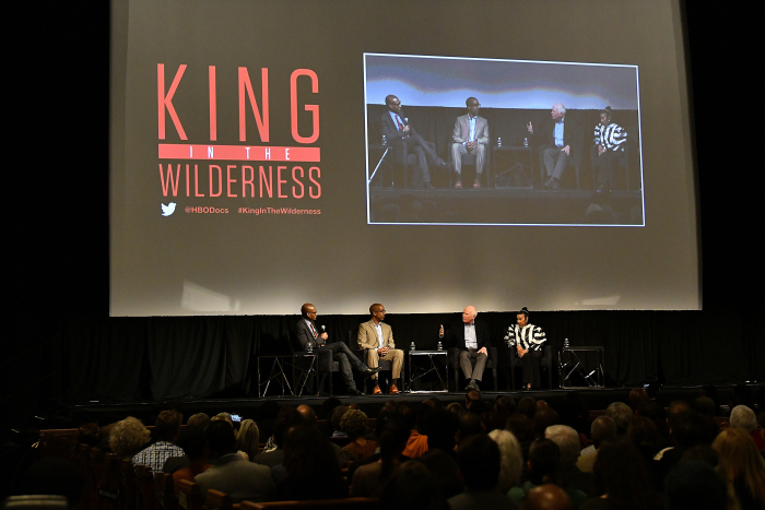 NEW YORK, NY – MARCH 26: (L-R) Panel moderator/journalist Charles Blow, author/executive producer Trey Ellis, author/executive producer Taylor Branch and Civil Rights activist Xernona Clayton attend screening and panel discussion for HBO’s “King in the Wilderness” on March 26, 2018 in New York City. (Photo by Slaven Vlasic/Getty Images)