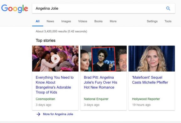 Now on April 28, this fake news is still being prioritized over new and accurate news, as seen in the screengrab below. That means when fans search “Angelina Jolie,” one of the first things they see in “Top Stories” is misinformation. This can’t even be excused away as the search engine merely showing the most recent article about Jolie. As the search result itself indicates, this post is from “3 days ago.” The notion that nothing about Jolie has been published online since then is implausible. Unfortunately, an old, inaccurate article, particularly one that was debunked, is instead being given prominence and visitors are getting fake news instead of fact-checked news.