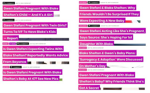 Apparently the online publication has already forgotten all about that narrative. HollywoodLies, as it’s known for its tendency to make-up stories, also seems to have forgotten that it already tried this current stunt last summer. On August 29, 2017, the website alleged Stefani was “acting like she’s pregnant” and “giving off preggo vibes.” Now almost exactly nine months have gone by, and not only is it clear that Stefani was not pregnant then, but the blog is now offering a suspiciously similar storyline about her supposedly seeming like she’s expecting. (See screengrabs below.)