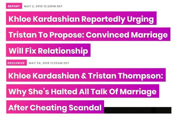 HollywoodLife is flip-flopping on whether Khloe Kardashian wants to marry Tristan Thompson. After claiming earlier this month that she was “urging” him to propose, the site now maintains she’s “halted” talk of marriage. Gossip Cop can explain how this proves the outlet doesn’t have real sources or genuine insight. See a screengrab of the contrasting headlines below.
