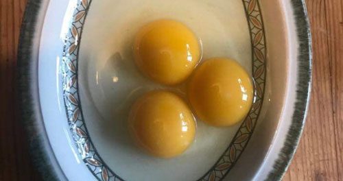 Lucky, the chicken who has lived up to her name AND HOW by squeezing out two triple yolk eggs twice!