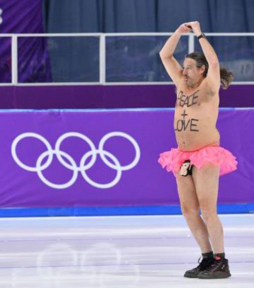 “Hmmm, I thought that 15-year-old Russian girl won the gold medal in women’s figure skating at the Olympics” is what you probably said to yourself after your eyes were gracefully brushed by the exquisite vision of a peaceful, love-spreading topless bearded ice dove in a monkey face dick pouch and pink tutu. But believe it or not, that tender winter pussy willow isn’t a gold medal-winning figure skater who makes it impossible for the judges to score him because they constantly get the stage 10 vapors and pass out every time he twirls. He’s a stage crasher who won the gold medal in attention whoring on Friday.