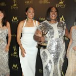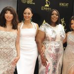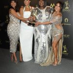 And here’s Jeannie Mai, whose head gave birth to clip-on bangs, with her The Real co-hosts (Tamera Mowry, Loni Love, and Adrienne Bailon) at the Daytime Emmy Awards on Sunday, where they won Best Talk Show Host.