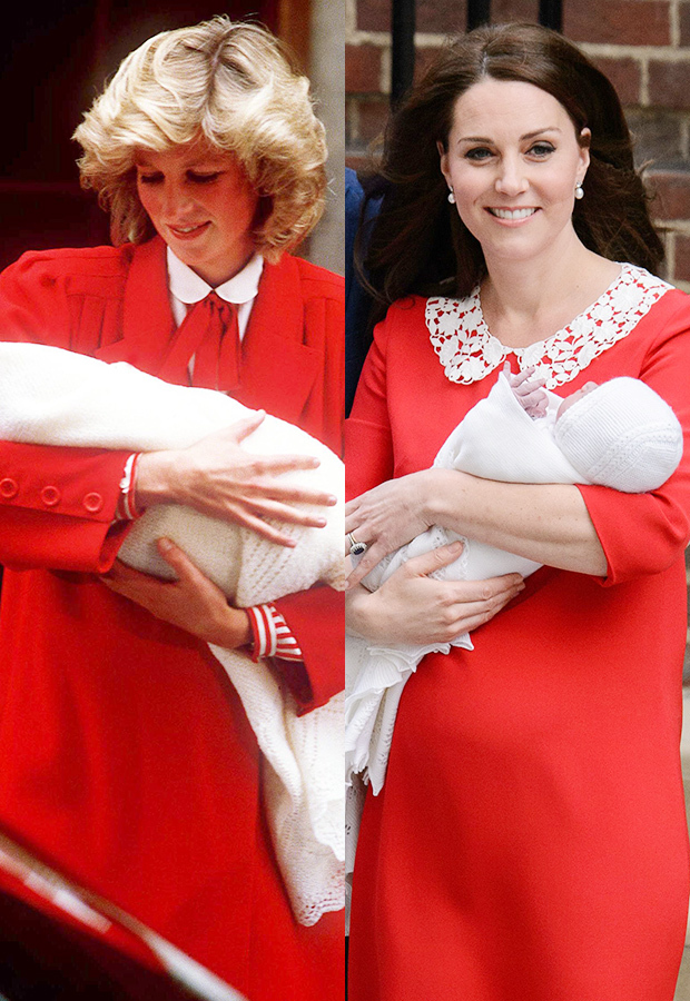 Kate Middleton, 36, left the hospital with her third baby on April 23, just hours after giving birth. She wore a stunning red Jenny Packham gown, with a white lace Peter Pan collar. This was first thought to be a nod to St. George’s Day, which is April 23, the day of England’s patron saint. But looking back on the fashion of the past, it was probably honoring Prince William’s late mother Princess Diana, who wore a red dress while exiting the hospital with Prince Harry in 1984. In fact, it’s quite similar!