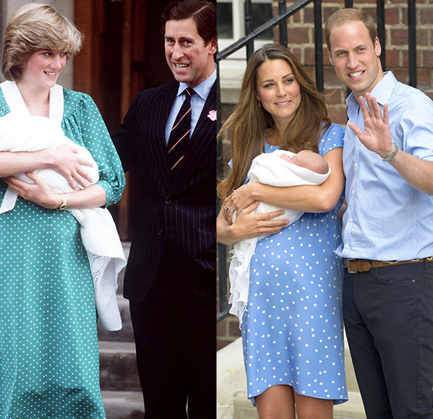 And of course, Kate wears Princess Diana’s sapphire and diamond engagement ring every day as a reminder of the love Diana had for her children. This isn’t the first time Kate has worn a nearly identical dress to Diana. Kate wore a blue and white polka dot dress when exiting the hospital with her first child George, now 4, in 2013. That was a nod to the dress Diana wore with baby William back in 1982. See the comparisons below!