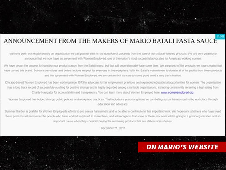 We noticed this huge banner posted on mariobatalisauces.com's landing page back in December 2017 shortly after sexual misconduct allegations first surfaced against the disgraced chef. The banner claims the makers of Batali's sauces are donating its proceeds to Women Employed, hailed as one of the nation's most successful advocates for working women.