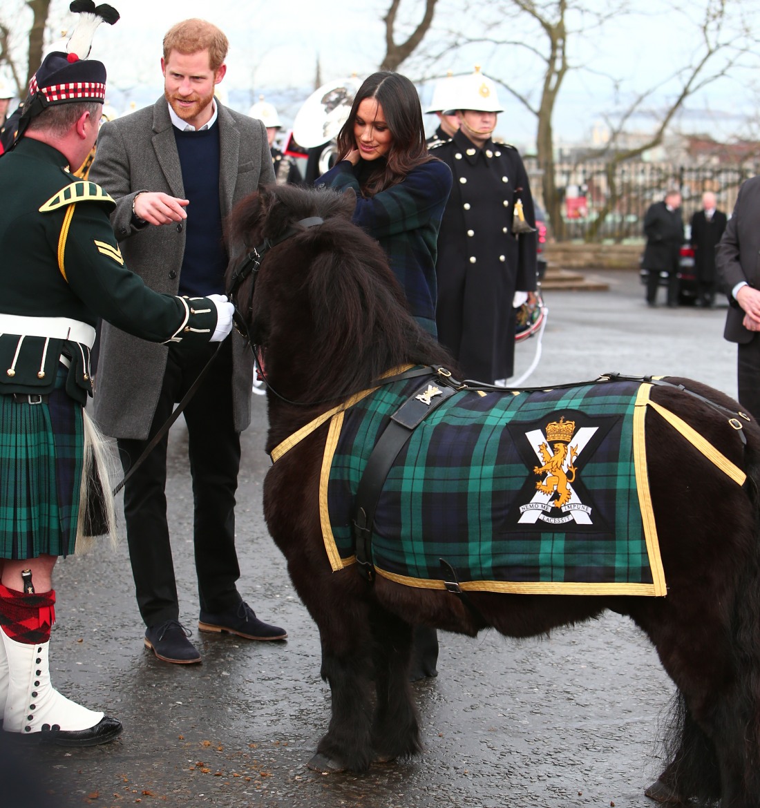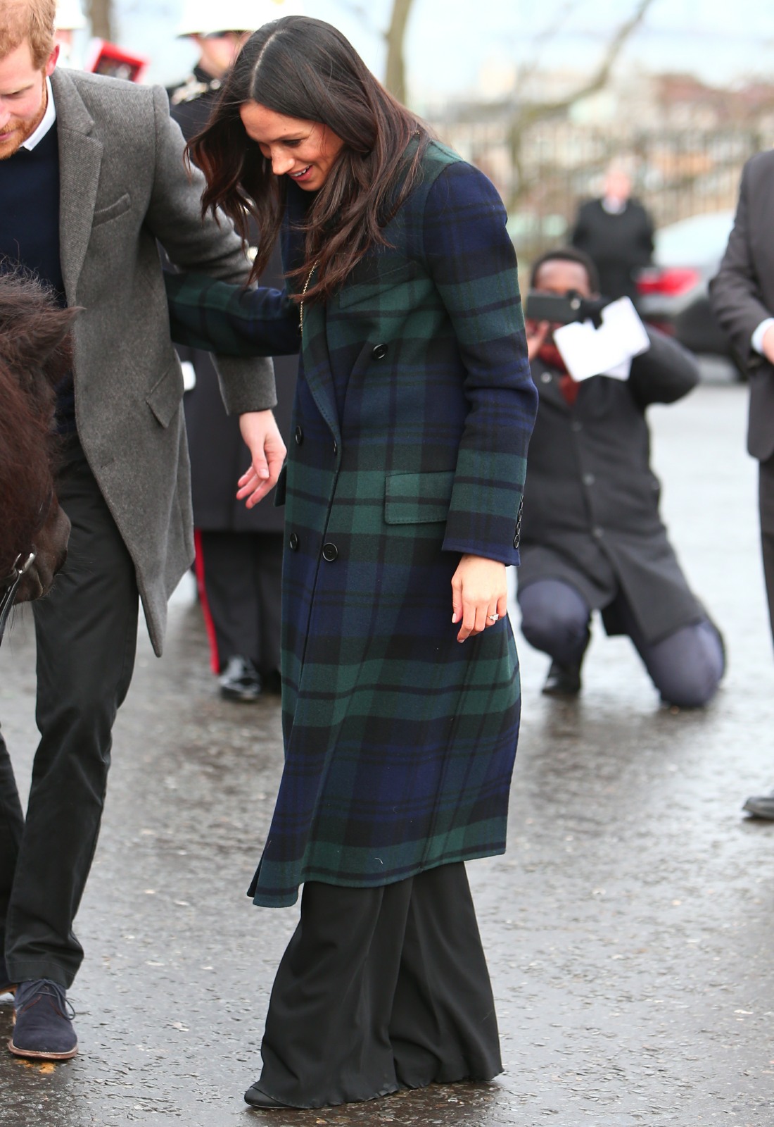 Meghan Markle and Prince Harry have started their day full of events in Scotland. They arrived in Edinburgh a short time ago, and these are photos from their first stop at Edinburgh Castle, where throngs of Scottish people were lined up to see them. For Meghan’s first official Scottish appearance, she wore TROUSERS!! AGAIN! I love how Meg is bringing back trousers. I love her taste in trousers too. The trousers are by Veronica Beard, and her tartan coat is by Burberry. YAS. She’s been wearing some strategic Burberry pieces for few months and I’m all for it. Burberry is pricey, but the pieces are SO beautiful. Both the trousers and the coat could have been tailored a little bit better – I like a too-long inseam too, but Meghan needs to get her trousers tailored just a little bit shorter. The coat is just slightly too bulky too. But overall, she looks lovely and warm.