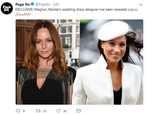 On Friday, the New York Post asked in a headline, “Has Meghan Markle’s wedding dress designer been revealed?” Its tweet was much more definitive, with the paper declaring, “EXCLUSIVE: Meghan Markle’s wedding dress designer has been revealed.” (See screengrab below.) The article itself began, “Meghan Markle could well have chosen close friend Stella McCartney to design her wedding dress.”