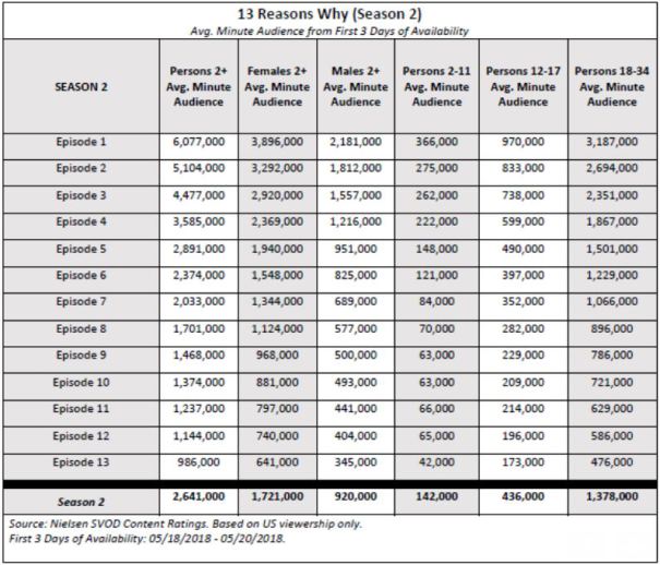 The second season of Netflix’s 13 Reasons Why drew an average minute audience of 2.6 million within the first three days of its May 18 debut, according to figures released by Nielsen.