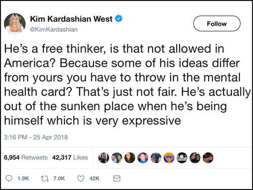 As Pimp Mama Kris leaks one of her koven member’s sex tapes to distract from this newest mess, Kim Kartrashian has defended her Trump tramp of a husband Kanye West by saying that he doesn’t have a mental health issue, never said he agrees with Trump’s politics, is just a free thinker, and is now “out” of the sunken place. Believe it or not, the “sunken place” she’s talking about isn’t when he’s suffocating between her beach ball ass cheeks while tossing her salad. But I don’t know, having your tongue all the way Trump’s butt tunnel seems like a pretty sunken ass place to be – Just Jared
