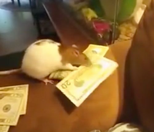 Meet Solstice, a pet rat from North Conway, New Hampshire who has tasted the sweet taste of MONAY and can’t get enough of it. Solstice’s human recorded a video of her stealing a $20 bill from a pile of cash lying on the sofa. After she takes her loot back to her lair, her human snatches the $20 back, and she doesn’t take that as a hint. She comes back for it and even tries to rip it directly out of the hand that feeds her. Pimp Mama Kris usually worships at the altar of her boss, Satan, but today she’s going to print out a picture of Solstice and worship in front of it. Because this money-grubbing rat is her new idol!