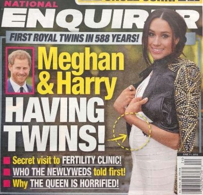 Meghan Markle is not pregnant with twins, despite a tabloid cover story published less than two weeks after she wed Prince Harry. This report actually uses a four-year-old photo of the new Duchess of Sussex to tell its pregnancy lie. Gossip Cop can bust it..