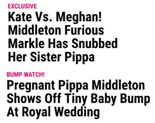 On Thursday, RadarOnline announced in a headline, “Kate Vs. Meghan! Middleton Furious Markle Has Snubbed Her Sister Pippa.” The article began with the contention that Markle “left her soon-to-be sister-in-law Kate Middleton’s famous sibling off the guest list for her royal wedding this weekend, and the Duchess of Cambridge is seething.” A so-called “source” was quoted as saying, “Meghan not inviting Pippa to the wedding has upset Kate.”