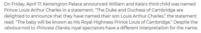 On Friday, Kensington Palace announced on Twitter that the Duke and Duchess of Cambridge decided to name their newborn son Louis Arthur Charles. According to the palace, he will henceforth be known as His Royal Highness Prince Louis of Cambridge. While the royal family has not officially explained the reasoning behind the name selection, Life & Style is announcing on its website, “Prince William and Kate Middleton’s Baby Name Was Probably Inspired by ‘The Princess Diaries.'”