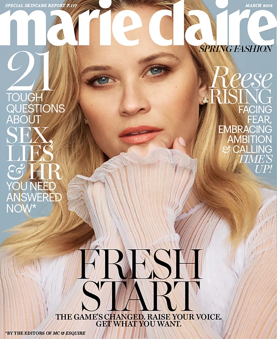 February 28, 2018There’s this constant debate that we’re always on the edge of: who should be forgiven, what should be forgiven, and should would give public figures – celebrities, politicians – the room to grow, to apologize, to change their minds, to learn from teachable moments. Several years back, I couldn’t stand Reese Witherspoon. I thought she was such a fake a–hole. But with everything that’s happened in the past year – from her success in shepherding Big Little Lies to her involvement with Time’s Up – I have genuine warmth for her. Do I still side-eye the fact that Reese is getting a lot of credit for “starting” Time’s Up and that this seemed to be a counter-reaction to CAA (her agency, and where her husband works) being accused of failing to repeatedly protect their young female clients? For sure. But let’s not put all of that on Reese, I guess. Reese covers the new issue of Marie Claire, and she’s got some interesting stuff to say:
