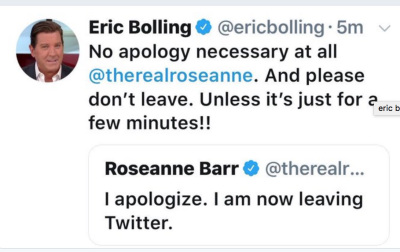 “No apology necessary at all @therealroseanne. And please don’t leave. Unless it’s just for a few minutes!!” former Fox News host Eric Bolling tweeted before deleting the message. Bolling parted ways with Fox News last year after lewd photos and text messages to female colleagues surfaced.