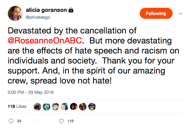 Alicia Goranson, who played Becky in the original Roseanne series and again in the revival, shared her thoughts Wednesday on the show’s sudden demise. Goranson posted on Twitter that she is “devastated by the cancellation”, adding “But more devastating are the effects of hate speech and racism on individuals and society.”
