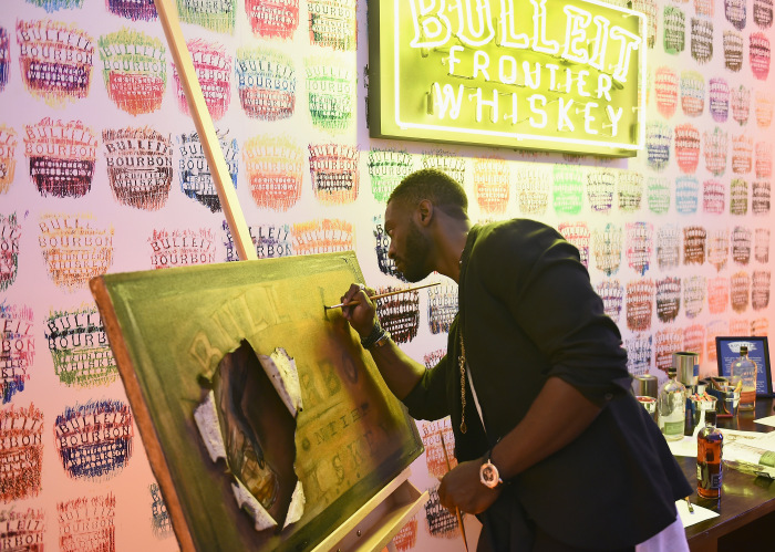 Bulleitt celebrated the new initiative in style with a launch Thursday at the Frieze Art Fair in NYC, complete with a “Frontier Works: Bottle Impressions” Whiskey Lounge where Hodge created a painting in homage to Buleitt’s signature bottle. Other artists, Tara McPherson and Taylor McKimens, also contributed art that reflected their impressions of the Buleitt bottle. Following the launch at Freize, the artists, their guests and other VIPs sat down for an intimate celebration dinner at Row House on Harlem’s Restaurant Row, that featured a Bulleit infused menu and Bulleit specialty cocktails.