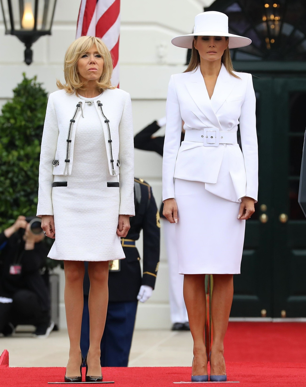April 25, 2018I admire the bloggers who completely avoid discussing Melania Trump’s fashion. They’re so strong! Personally, I try to only cover Melania’s fashion when it’s notable or very bad or very funny. This is one of those weeks. The Trumps have been hosting the French president and French first lady for days for an official state visit. Yesterday was the big daytime press conference and White House greeting, and the evening was for the state dinner. The state dinner was completely overshadowed by Melania’s giant white hat during the day, and the hat was overshadowed by typical Bigly shenanigans. First off, The White Hat of Doom: Melania’s entire white ensemble is Michael Kors. She didn’t take the hat off all f-cking day, not even when they were inside. Some of the videos that went viral were… amazing. Here’s Bigly’s baby fist trying to hold Melania’s hand: