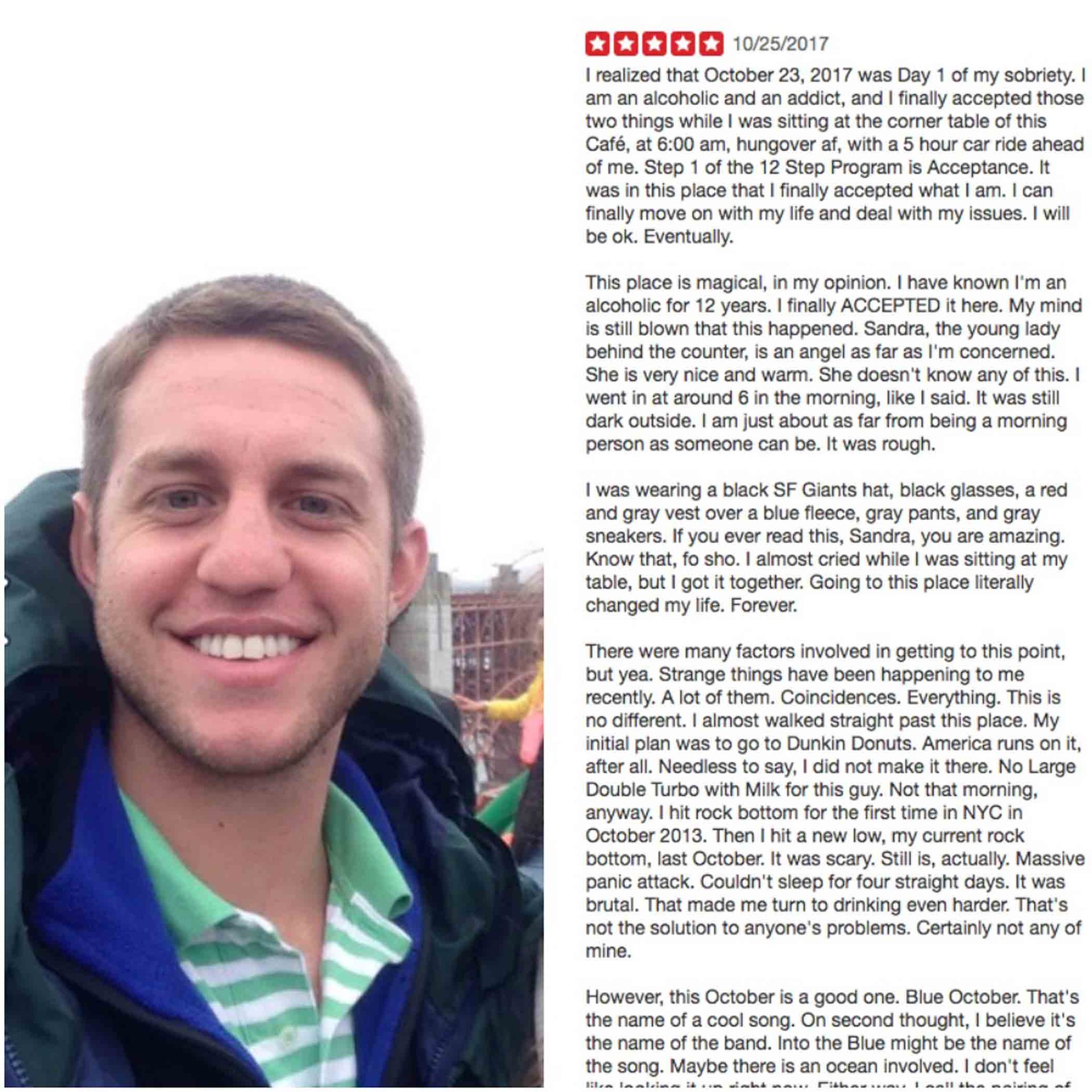 Matthew Goodyear admits he's not one for posting Yelp reviews each and every time he eats out, but after a morning of serious self-reflection, he knew it was time for his first post. After the 27-year-old finally realized that he was losing an ongoing battle with alcohol, he decided to open up about his struggle in a brutally honest Yelp review of a little place called Pignone's Café.